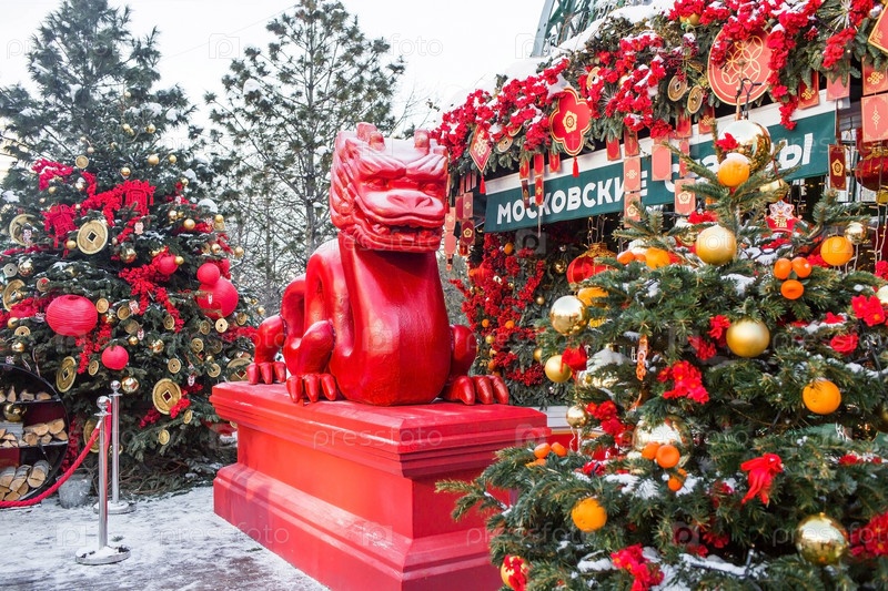 Дракон и китайские красные рождественские фонарики на Тверской улице в Москве. Крупный план. Первая в истории встреча Китайского Нового 2024 года в Москве
