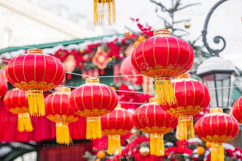 Китайские красные рождественские фонарики на Тверской улице в Москве. Крупный план. Первая в истории встреча Китайского Нового 2024 года в Москве