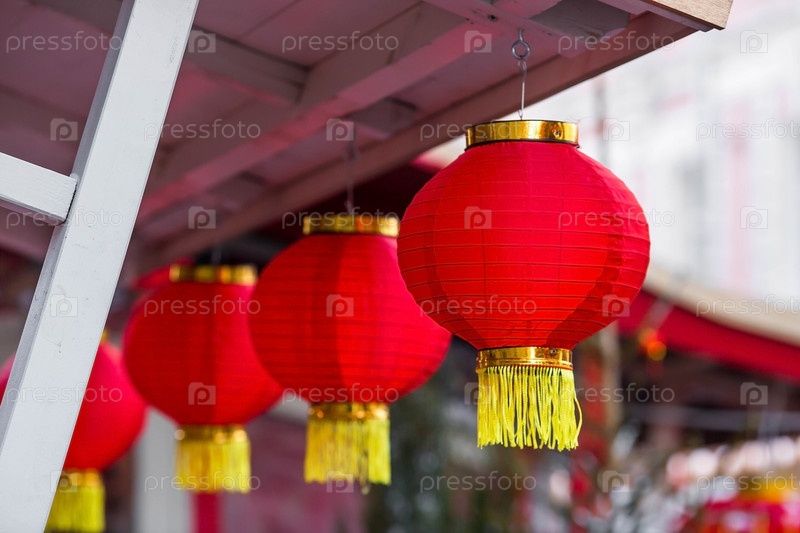 Китайские красные рождественские фонарики на Тверской улице в Москве. Крупный план. Первая в истории встреча Китайского Нового 2024 года в Москве