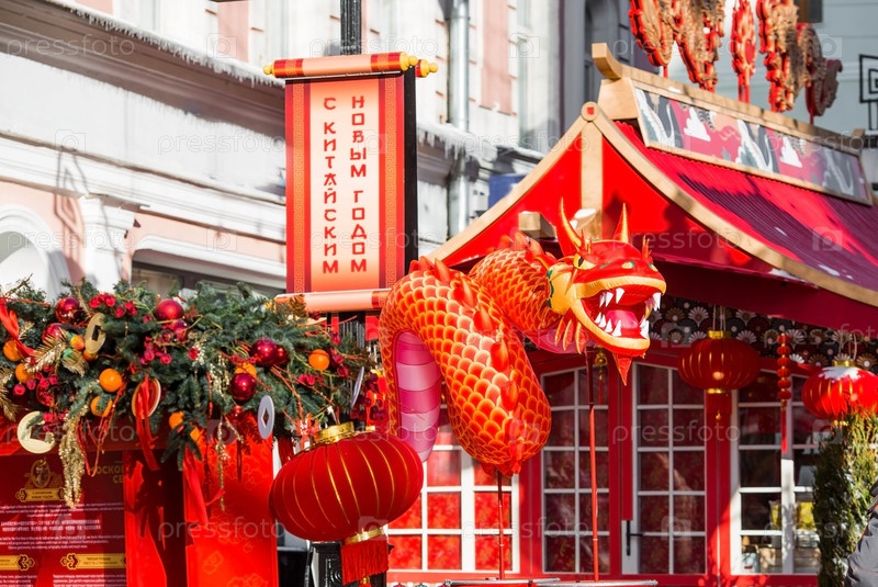 Дракон и китайские красные рождественские фонарики на Тверской улице в Москве. Крупный план. Первая в истории встреча Китайского Нового 2024 года в Москве