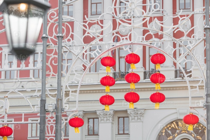 Китайские красные рождественские фонарики на Тверской улице в Москве. Крупный план. Первая в истории встреча Китайского Нового 2024 года в Москве