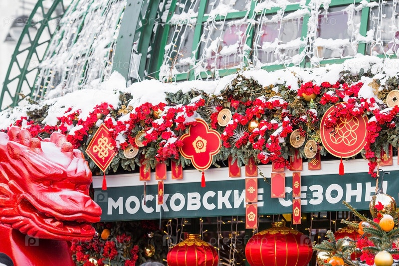 Китайские красные рождественские фонарики на Тверской улице в Москве. Крупный план. Первая в истории встреча Китайского Нового 2024 года в Москве