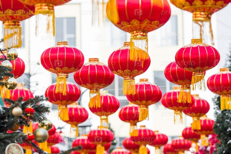 Китайские красные рождественские фонарики на Тверской улице в Москве. Крупный план. Первая в истории встреча Китайского Нового 2024 года в Москве