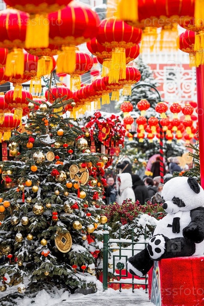 Мягкие плюшевые панды и китайские красные рождественские фонарики на Тверской улице в Москве. Крупный план. Первая в истории встреча Китайского Нового 2024 года в Москве
