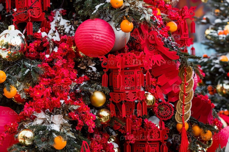 Китайские красные рождественские фонарики на Тверской улице в Москве. Крупный план. Первая в истории встреча Китайского Нового 2024 года в Москве