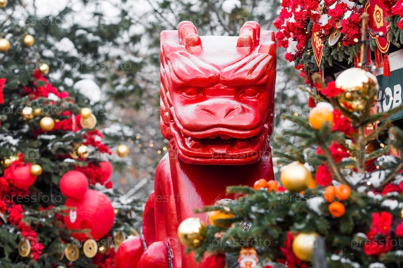 Дракон и китайские красные рождественские фонарики на Тверской улице в Москве. Крупный план. Первая в истории встреча Китайского Нового 2024 года в Москве