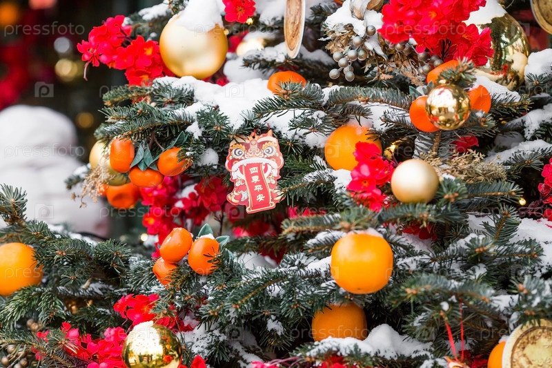 Китайские красные рождественские фонарики на Тверской улице в Москве. Крупный план. Первая в истории встреча Китайского Нового 2024 года в Москве