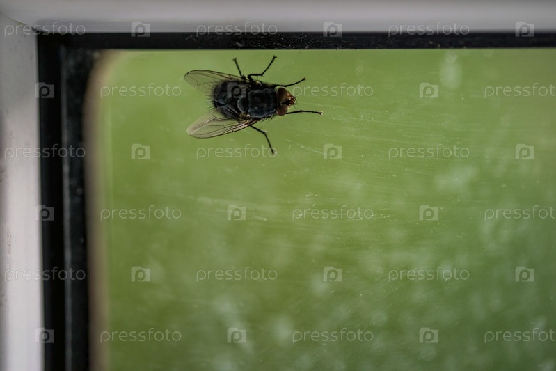 Большая милая толстая пушистая муха на грязном оконном стекле