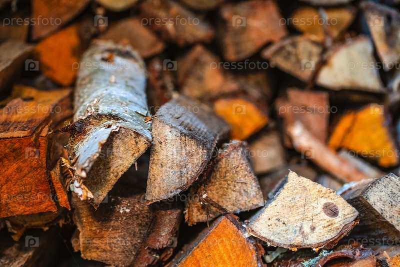 Дрова, сложенные в поленницу, размытый фон, текстура