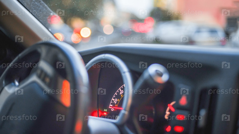 Ночной интерьер автомобиля, ночной город на заднем плане