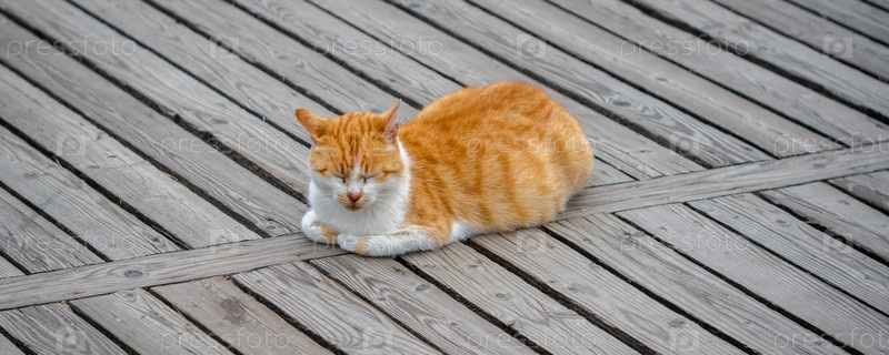 Рыжий кот спит на полу на тротуаре