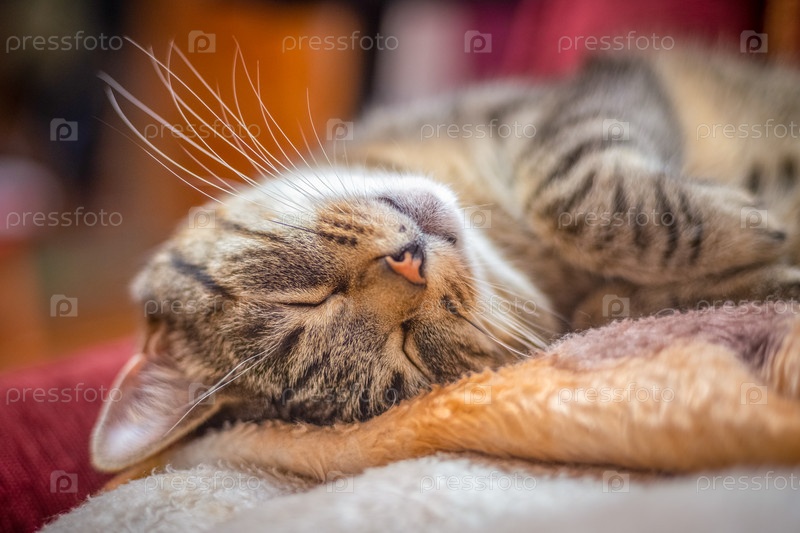 Милый кот сладко спит, уютно устроился, крупный план, размытый фон