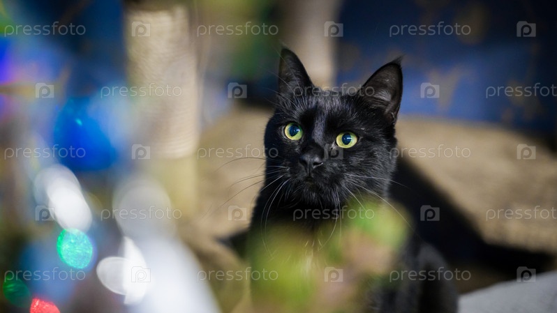Черный кот с удивлением смотрит на елку с праздничными огнями