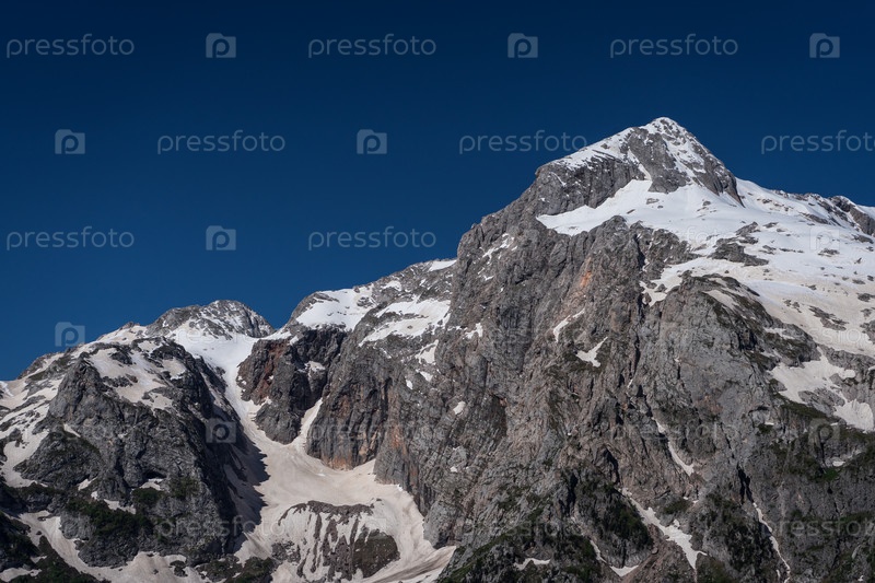 Вершина горы частично покрыта снегом. Горная вершина Фишт в горах