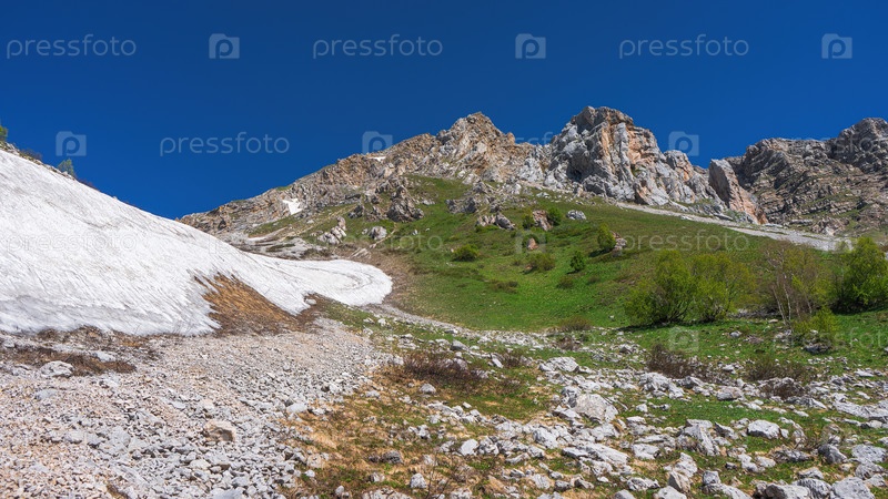 Ледник весной у подножия гор. Окрестности горы Фишт на Кавказе