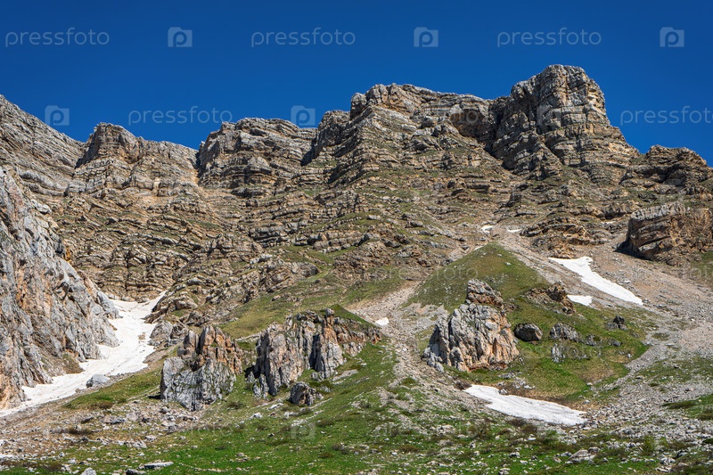Отвесные скалы весной с не полностью растаявшими ледниками