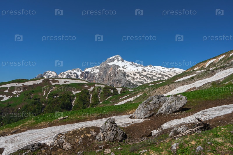 Ледник весной у подножия гор. Окрестности горы Фишт на Кавказе