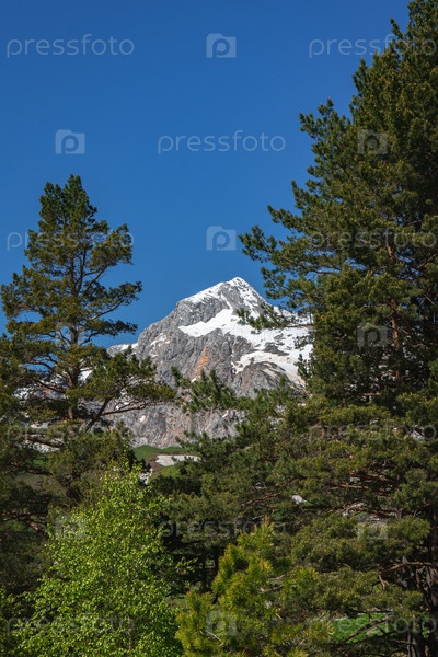 Вертикальный вид с деревьев на горную вершину под голубым небом. Горные пейзажи
