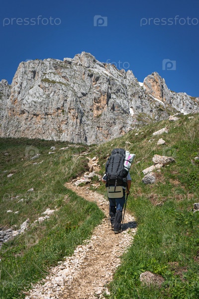 Турист с рюкзаком идет по тропе в горах. Поход в горы