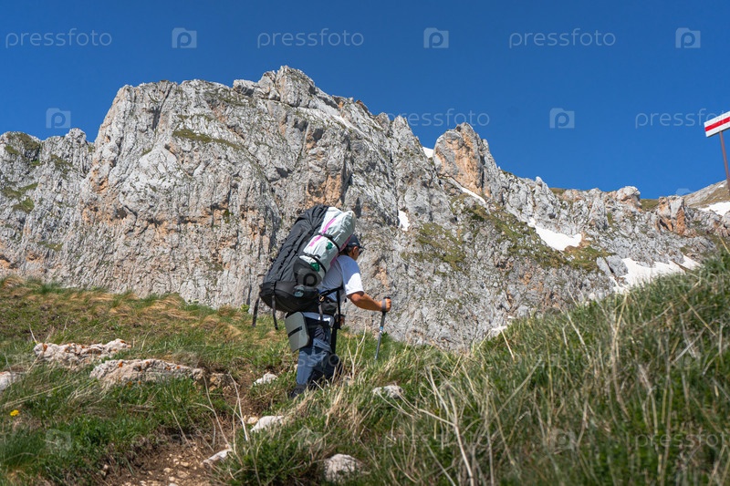 Турист с рюкзаком идет по тропе в горах