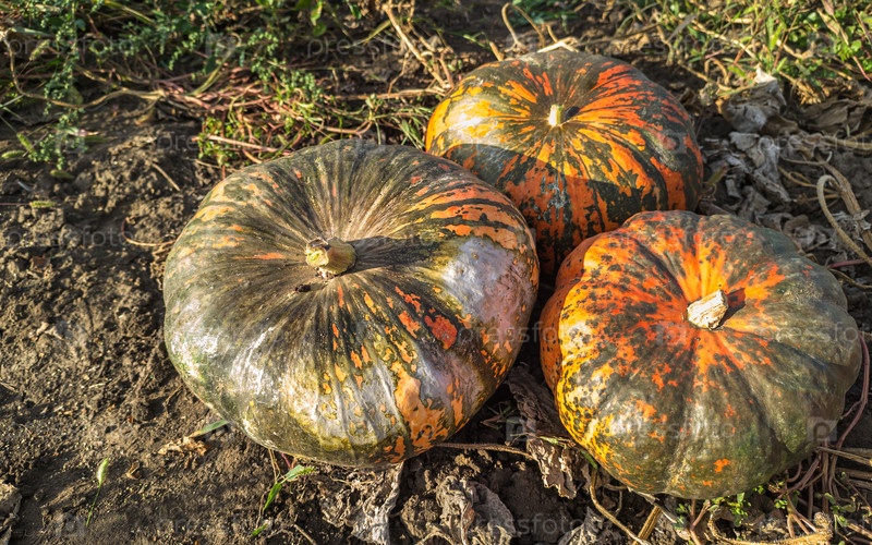 Несколько спелых оранжевых тыкв в саду. Большая тыква в заросшем поле. Сбор урожая