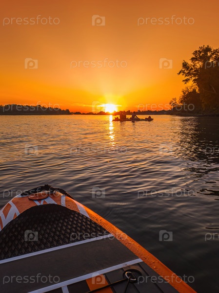 Планшет SUP на фоне поверхности воды в крупном плане.Оборудование для серфинга и SUP при закате света в крупном плане