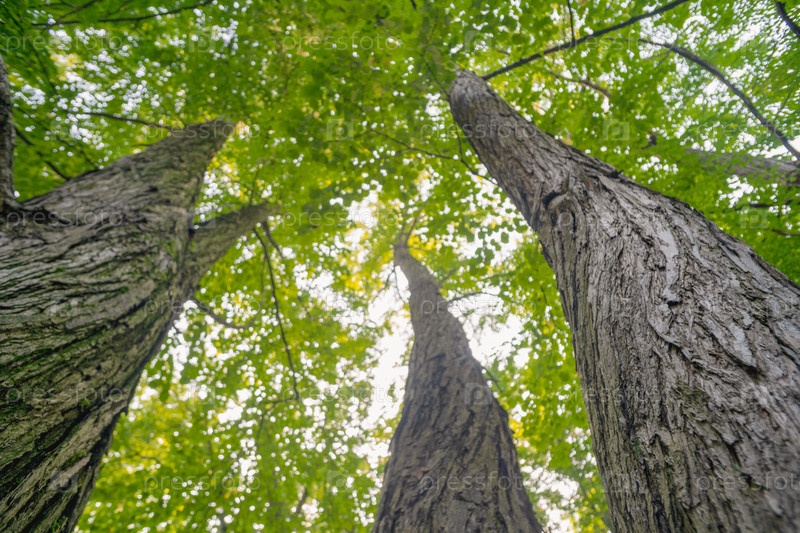 Большие деревья в лесу с пышной зеленой листвой, вид снизу
