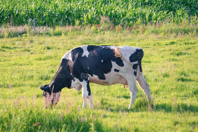 Коровы пасутся на сочном лугу в летний день