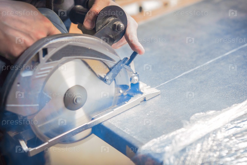 Плотник режет деревянную панель электроинструментом