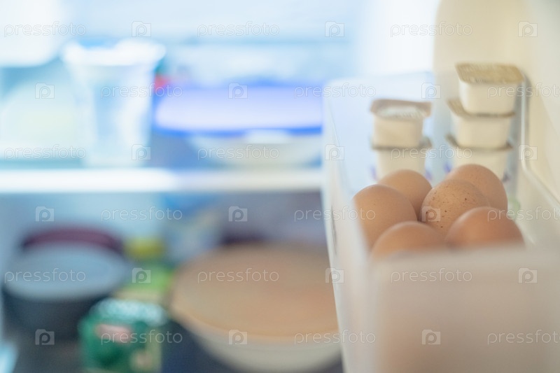 Открытая дверь холодильника, размытый фон продуктов