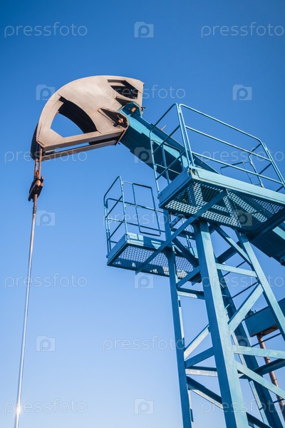 Масляный насос на фоне голубого неба и утреннего солнца, солнечные блики на масляном насосе