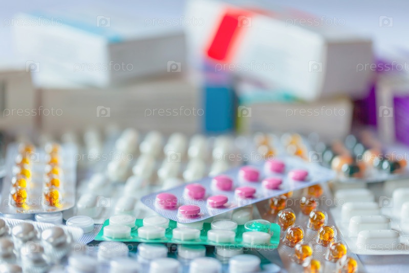 Куча различных медицинских таблеток и капсул, размытый фон