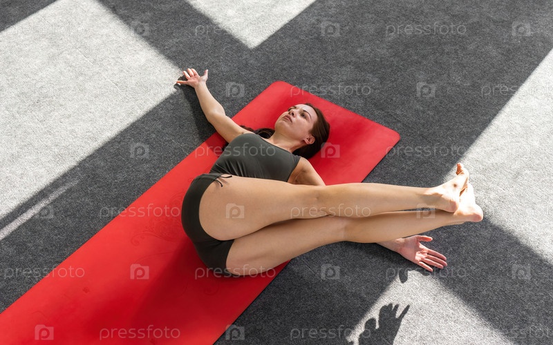 Растяжка, йога и женщина на красной дорожке для тренировок, упражнений. Ноги, растяжка и леди с гибкими тренировками по фитнесу или пилатесу для баланса, медитации или хорошего самочувствия