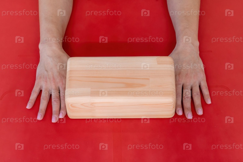 Крупным планом сильные активные женские руки на деревянных органических кирпичных реквизитах йоги, выполняющих занятия в тренажерном зале. Женщина практикует аэройогу Айенгара на веревке Ардха Уттанасана в позе натуральных инвентарных материалов