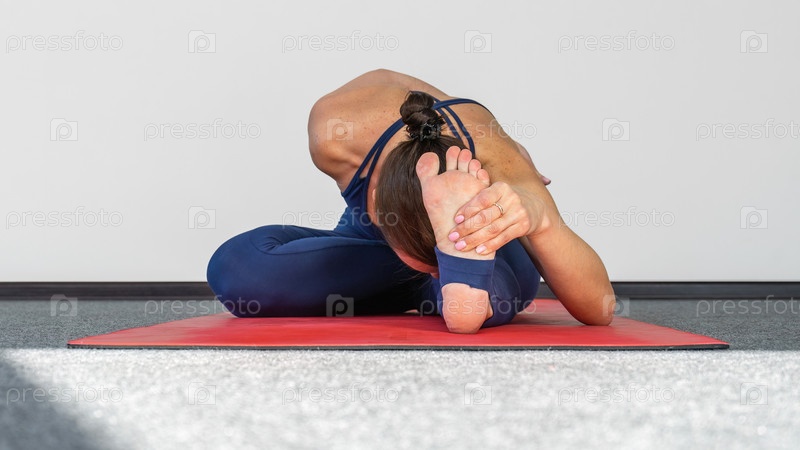 Растяжка, йога и женщина на красной дорожке для тренировок, упражнений. Ноги, растяжка и леди с гибкими тренировками по фитнесу или пилатесу для баланса, медитации или хорошего самочувствия
