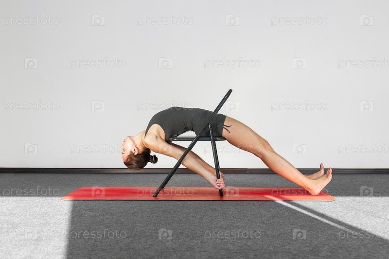 Практикующий йогу в спортивной одежде, стул используется в качестве опоры для выполнения позы прасарита паршваконасана. Концепция гибкости