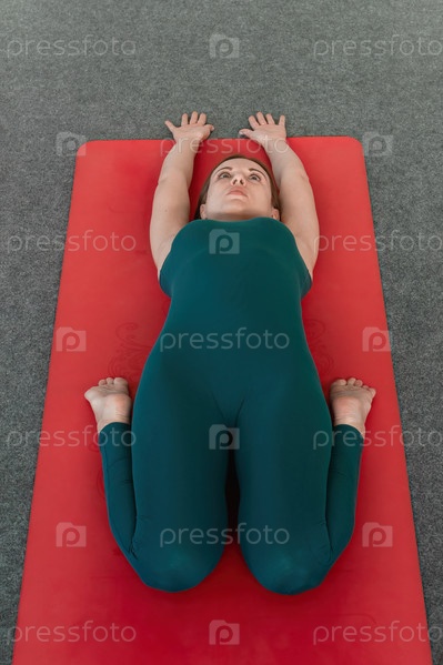 Растяжка, йога и женщина на красной дорожке для тренировок, упражнений. Ноги, растяжка и леди с гибкими тренировками по фитнесу или пилатесу для баланса, медитации или хорошего самочувствия