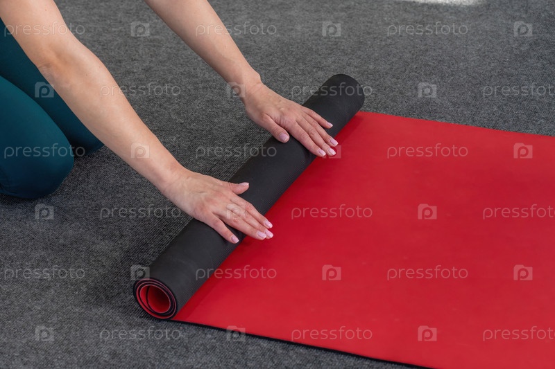 Обрезанное изображение коврика для йоги. Девушка разматывает ковер. Йога