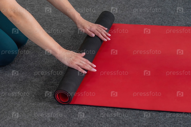 Обрезанное изображение коврика для йоги. Девушка разматывает ковер. Йога