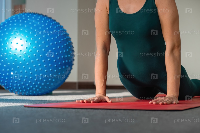 Растяжка, йога и женщина на красной дорожке для тренировок, упражнений. Ноги, растяжка и леди с гибкими тренировками по фитнесу или пилатесу для баланса, медитации или хорошего самочувствия