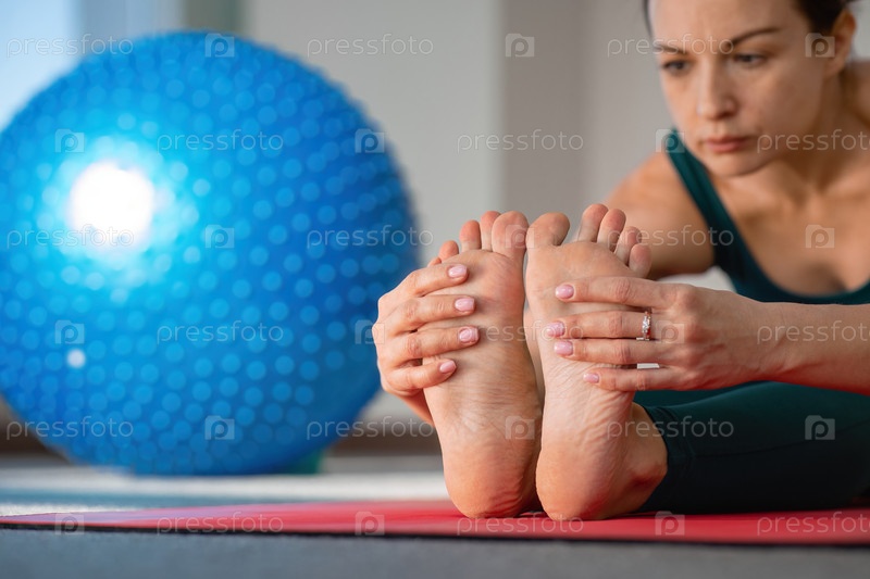 Растяжка, йога и женщина на красной дорожке для тренировок, упражнений. Ноги, растяжка и леди с гибкими тренировками по фитнесу или пилатесу для баланса, медитации или хорошего самочувствия