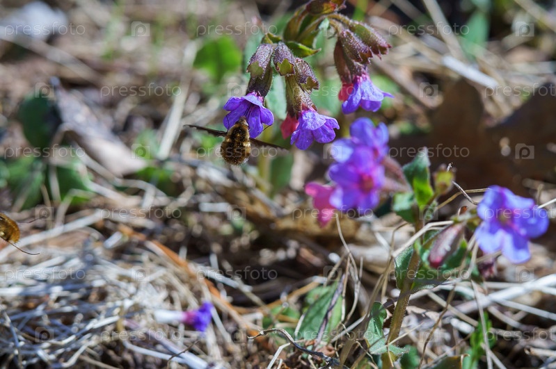 Маленький голубой цветок на зеленом фоне. Фиолетовый цветок на траве