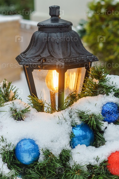 Декоративный фонарь с желтой лампочкой. Елочные игрушки и декоративный фонарь на улице. Украшаем город к Новому году