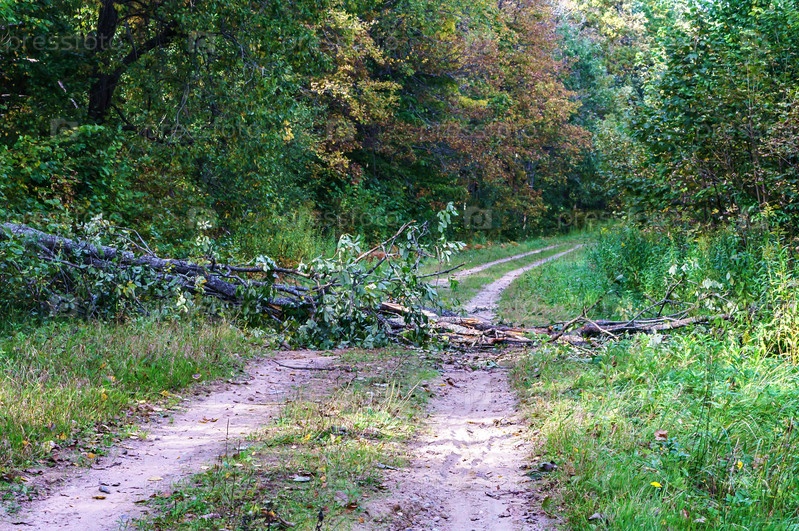 Осенний лес. Лес после грозы. Дерево упало на дорогу