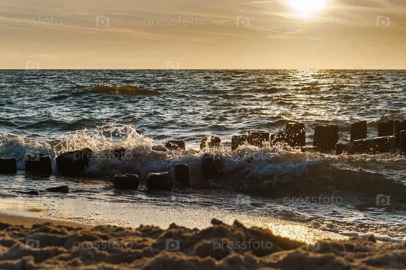 Морской закат. Волны разбиваются о волнорезы. Брызги от морских волн