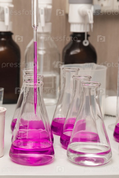 Колбы с жидкостью розового цвета. Химический анализ, органический анализ воды в лаборатории