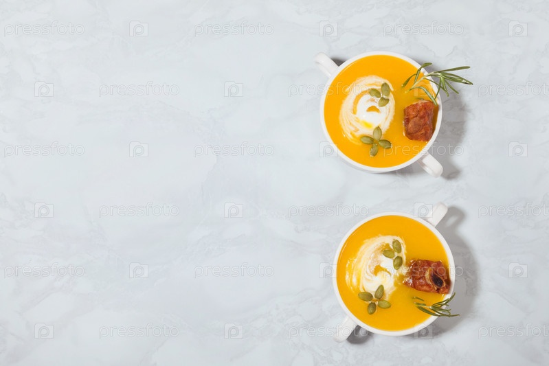 Суп-крем из тыквы с копчеными свиными ребрышками и сливками, вид сверху, с местом для копирования