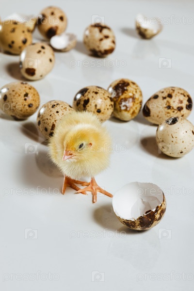 Курица-перепелка щурится среди перепелиных яиц. Птицеводство в инкубаторах