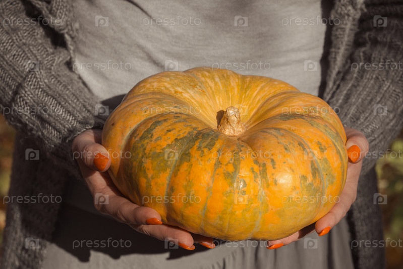 Женщина дарит спелую оранжевую круглую тыкву