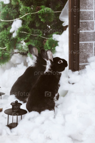 Черный кролик в искусственном снегу возле зеркала смотрит в сторону. Символ года в снежных украшениях